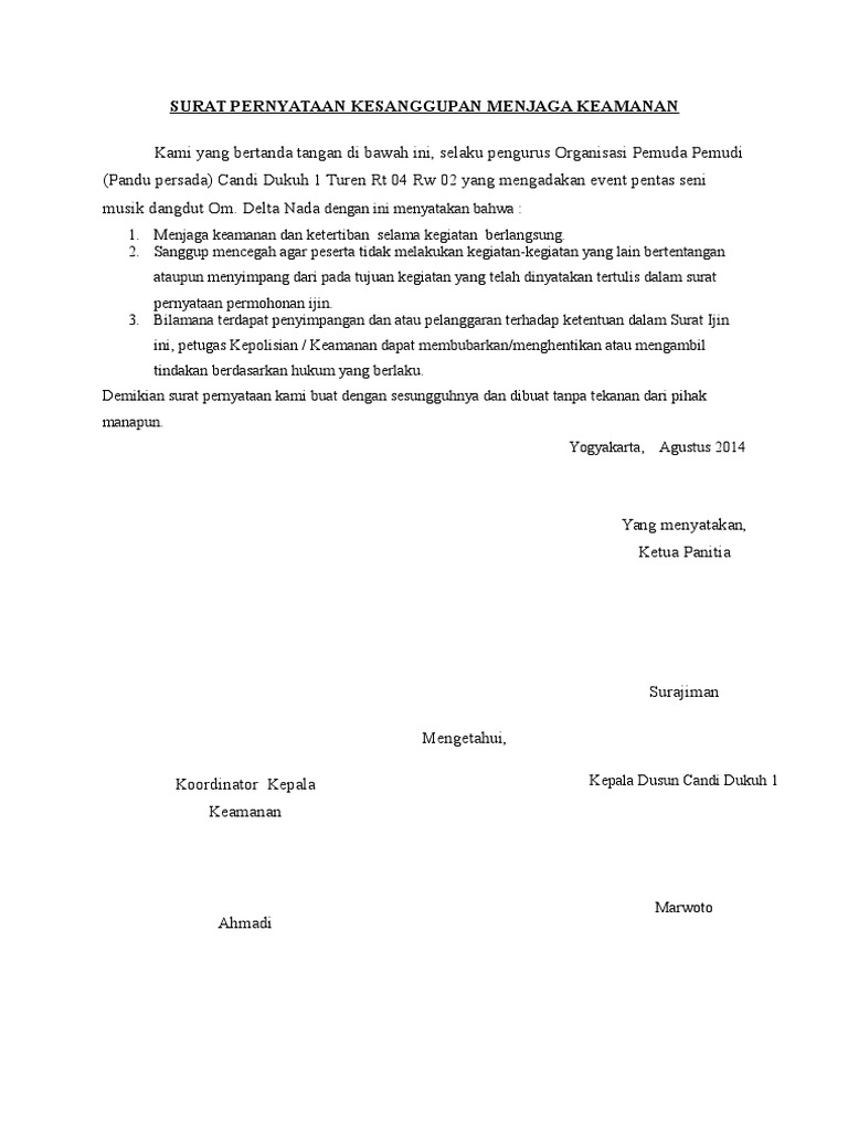 Berikut contoh surat pernyataan yang menjadi syarat dalam lamaran kerja untuk menjadi aparatur sipil negara (asn). Contoh surat surat keterangan rt surat keterangan rt yang diketahui ketua rw adalah merupakan inti pokok dari pembuatan berbagai macam surat, baik surat yang dikeluarkan dari desa/kelurahan maupun dari instansi. Sesuai namanya surat pernyataan adalah sebuah surat yang menyatakan bahwa si penulis surat telah siap untuk melakukan sesuatu atau bisa saya rasa lengkap sudah pembahasan kita kali,dari mulai tips dan contoh surat pernyataan kesanggupan diri sudah saya informasikan kepada. Berikut ini contoh surat pernyataan kerja yang dibuat oleh calon pegawi pada saat akan masuk menjadi pegawai perusahaan. Namun untuk kasus tertentu, adakalanya harus menggunakan pernyataan tertulis. Saat membuat surat pernyataan salah satu tujuannya adalah untuk menyatakan kesanggupan kita melakukan suatu jenis pekerjaan tertentu. Sama seperti surat pernyataan lain, surat pernyataan kesanggupan menggunakan bahasa indonesia baku mari simak beberapa kategori surat pernyataan kesanggupan berikut contohnya berikut. Surat pernyataan kesanggupan menjaga keamanan. Dengan surat ini, saya yang beridentitas di bawah ini resiko dalam menjalankan tanggung jawab pengawasan ini akan saya tanggung bersama tim pengawas yang lain. Jadi surat ini sangat terikat dengan pihak lain. Surat pernyataan merupakan sebuah kesanggupan seseorang atas sebuah kesepakatan dengan pihak terkait, seperti lebaga atau perusahaan secara tertulis dan sifatnya resmi. Hal ini karena mengingat bahwa orang yang awam sekalipun mayoritas pernah membuatnya untuk keperluan tertentu. Yang mengadakan eent pentas seni musik dangdut om# delta $ada.