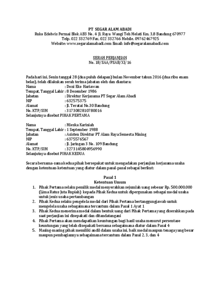 Siapa saja pastinya selalu melakukan kerjasama untuk semakin memperluas link ataupun sebagai bentuk kerjasama dalam ada berbagai bentuk kerjasama, seperti kerjasama bagi hasil, investasi, atau pemberi modal sebuah usaha. Untuk kerjasama perorangan, maka bisa menggunakan contoh surat perjanjian kerjasama usaha, baik kerjasama usaha 2 orang atau 6. Contoh surat perjanjian kerjasama usaha yang baik harus memenuhi sejumlah syarat tertentu. Documents similar to contoh surat perjanjian kerjasama bagi hasil. Contoh surat perjanjian kerjasama bagi hasil contoh surat. Artikel makalah tentang surat perjanjian kerjasama usaha, untuk kerjasama perorangan, dalam bisnis yang lebih baik, untuk usaha yang akan di lakukan. Surat perjanjian kerjasama usaha restoran paling enak. Surat perjanjian tersebut juga di buat di atas materai jadi tidak perlu khawatir jika terjadi sengketa dengan. Yang bertanda tangan di bawah ini : Hal ini dilakukan supaya terhindar dari kontroversi yang terjadi di kemudian hari. Berikut penjelasan lebih lanjut cara membuatnya! Kapan mou ini mulai berlaku serta tanggal berakhirnya. Melihat dari manfaat dan isi surat perjanjian kerja sama usaha di atas, kita tentu sudah dapat menggambarkan poin apa saja yang harus dimasukkan dalam surat perjanjian kerjsa sama usaha.