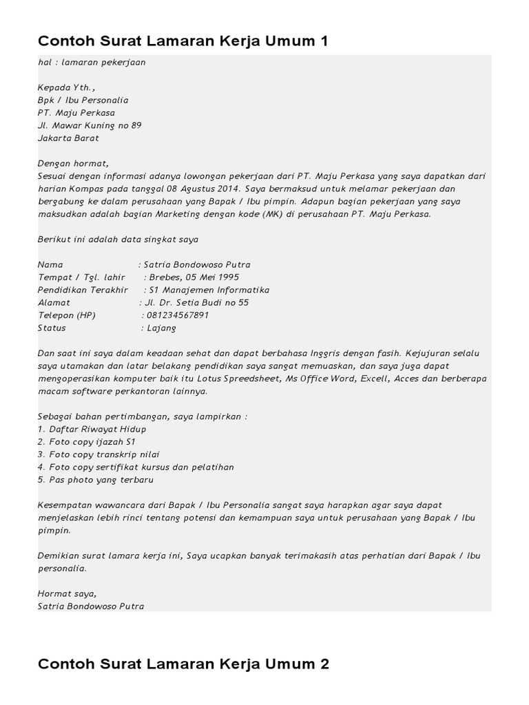 Dan berikut kami akan memberikan contoh surat lamaran kerja lengkap. Dalam pembuatan surat lamaran kerja di pt anda harus menulis posisi yang sesuai dengan yang dibutuhkan pt tersebut. Adalah alamat email perusahaan nomer 2: Itulah contoh surat lamaran kerja umum yang sudah banyak digunakan orang. Jika anda membutukan contoh surat lamaran kerja umum, anda bisa coba baca beberapa referensi yang telah kami buat dari text dan dengan gambar.