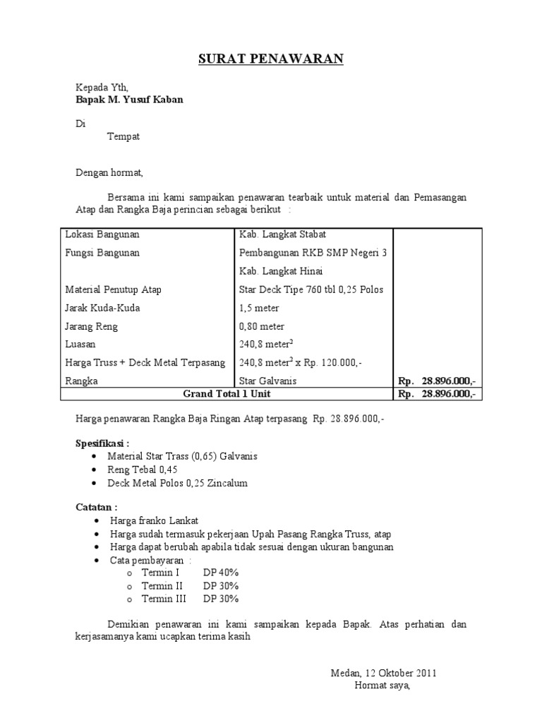 Mencantumkan rincian kemudahan, seperti gratis sumber: Makmur sentoa akan merencanakan pembangunan dua. Surat penawaran merupakan suatu surat yang ditujukan kepada suatu instansi yang bertujuan untuk menawarkan sesuatu. Surat penawaran harga adalah salah satu jenis surat yang dikenal dalam dunia bisnis. Contoh surat penawaran untuk berbagai keperluan.